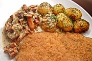 Panierowany kotlet drobiowy, gotowane młode ziemniaczki z koperkiem przesmażone na tłuszczu, surówka porowa, sos kurkowy.