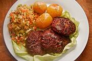 U nas ziemniaki z wody podane z mielonymi (z musztardą, oregano, koperkiem, słodką papryką i startym serem żółtym) oraz sałatą ze śmietaną. Przaśnie jakoś takoś :)