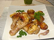 Wczoraj rosół z poprzedniego dnia i kaszanka z grilla. Dzisiaj pieczone udka, gołąbki z mięsem, młode ziemniaki z koperkiem i sałatka wiosenna z sosem czosnkowym .Do picia sok jabłkowy i woda mineralna z cytryną.