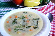 Krupnik na indyku, z fasolką szparagową. i micha warzyw gotowanych na parze, polanych przesmażoną na maśle bułka tartą, brokuł, kalafior i fasolka szparagowa.