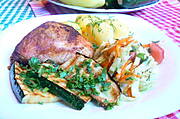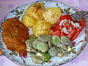 Zapiekane ziemniaki z serem i ziołami,kotlet drobiowy, sałatka z pomidorów i bób z masłem.Do picia herbata schłodzona z cytryną, woda mineralna.