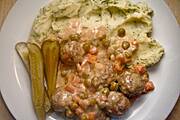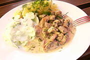 Gulasz z indyka w śmietanie i zieleninie,ziemniaki tłuczone z koprem ,mizeria ....