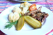 Udko pieczone z kuczaka,ziemniaki z koperkiem,ogóras kiszony,kalafior z masełkiem i bułką tartą.