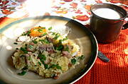 Tak to są ziemniaki ugotowane i utłuczone z przesmażonym wędzonym boczkiem i piórkami z cebuli (zielonej) pokrojonymi w kostkę.........na kaszubach zaleweją to maślanką lub kwasnym mlekiem, u nas jednak wersja z maślanką w szklance MNIAM
