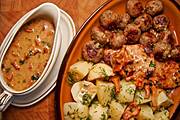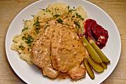 Pulpeciki z szynki, pieczone plastry schabu, ziemniaki z koperkiem, sos kurkowy.