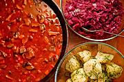 Gulasz wieprzowy, ziemniaki z koperkiem, zasmażana modra kapusta.