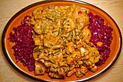 Reszta gulaszu wieprzowego, a że go zostało malutko to dodałem pokrojoną w kostkę i usmażoną pierś z kurczaka, ugotowane ziemniaki, zieloną fasolkę szparagową, śmietankę i troszkę przyprawy curry. Do tego zasmażana modra kapusta.