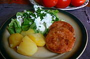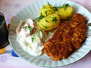 Ziemniaki z wody, sałata ze śmietaną i kotlety z mortadeli