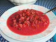 Wczorajsza pomidorówka, bób z masłem i dla chętnych chłodny kompot wiśniowy z makaronem.