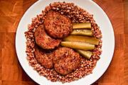 Kotlety mielone, kasza gryczana, ogórki kiszone.