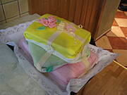 Możesz np.upiec 3 podłużne biszkopty( pamietaj zawsze o nasączeniu ich ponczem)- każdy w innym "rozmiarze", od największego do najmniejszego, każdy z nich możesz wg uznania przełożyć tą samą masą, lub każdy z nich przelożyć inną masą(ja robię na bazie kremówki,ale można też z torebki gotowca), a następnie przygotuj 3 masy plastyczne: każdą w innym kolorze, obłóż nimi każdy z tortów, na największym po przekątnej ułóż średni tort, a na nim asymertycznie najmniejszy tort-teraz zrób z masy plastycznej wstążkę bardzo długą by obwiazać całość jak pakunek,na krzyż tortu, a na górę stwórz kokardę ( masę plastyczną skleja się odrobinką wody lub białka kurzego, lub specjalnym jadalnym klejem)- właśnie otrzymałaś tort w ksztacie dużego pakunku.