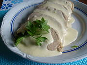Filety z kurczaka w sosie pieczarkowym, tłuczone ziemniaki z koperkiem, smażony panierowany ser pleśniowy (Lazur).