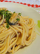 Spaghetti z owocami morza w śmietanowo - pomidorowym sosie z natką pietruszki .