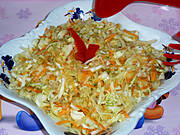 Kapuśniak i ryż z jabłkami i rodzynkami.