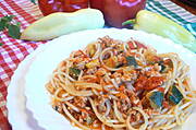 Jesienne leczo:) Ostatnia młoda cukinia, podduszona cebulka, soczyste pomidory i podsmażona aromatyczna kiełbaska. Jeden garnek - tyle sytości i radości.