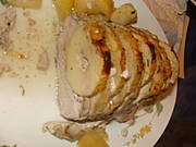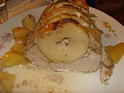 Zuzanno, ja dawno temu skorzystałam z przepisu zamieszczonego w jakiejś gazecie, przepisałam do swojego kajecika i stosunkowo często robię, bo wychodzi soczysty i winny. Schab ok1,5kg, kroję w 1,5cm plastry ale nie do końca,żeby spód pozostał w całości (około 2/3 ) marynuję całą noc w mleku, płuczę i przyprawiam solą, pieprzem i majerankiem. Między plastrami układam 0,5cm plastry jabłka ze skórką, spinam wykałaczką ścisło. Do nagrzanego piekarnika 200 stopni , nakryty. Po godzinie odkrywam, dorzucam 2 jabłka pokrojone w ćwiartki i piekę jeszcze około pół godzinki. Polewam wytworzonym sosikiem.