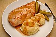 Barszcz chrzanowy z kiełbasą i ziemniakami. Pieczone filety z kurczaka z sosem pieczeniowym, tłuczone ziemniaki, kiszone ogórki.