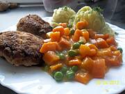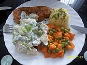 Kotlet mielony, ziemniaki z pesto z bazylii i marchewka z groszkiem a do popicia kompot z jabłek, śliwek i brzoskwiń:)