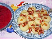 Wczorajszy barszcz czerwony, kluski śląskie z przesmażonym boczkiem wędzonym i cebulką.