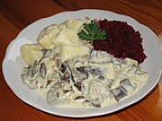 Leniwe kopytka :), sos z opieniek i końcówka moich ulubionych buraczków zasmażanych z jabłkiem.