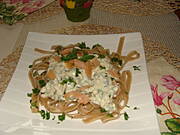 Dzisiaj szybkie jedzonko, makaron ciemny z sosem serowym, z natką i łososiem.
