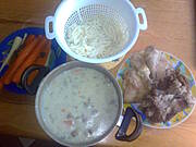 Rosół na bogato (wołowina, kawałek indyka, ręce z gęsi i nogi z kurczaka) z makaronem. Dla mnie i dzieci- kluski leniwe, a dla chłopa kotlety sojowe ( jojczał już od miesiąca, a że ja ich nie lubię, to co wróciłam ze sklepu, to twierdziłam, że nie byyyło. No ale dzisiaj się zlituję...