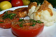 Kalafior z bułką i masłem ,filet z kurczaka i pomidory zapieczone po prowansalsku .....