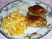 Ryż, pieczone szyneczki miodowe z kurczaka i surówka z białej kapusty.