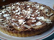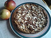 Jabłka zostały wymieszane z łychą soku z cytryny, 2 łyżkami rozpuszczonego masła, sporą szczyptą cynamonu i łyżką brązowego cukru :) To co z jabłek po skrojeniu "płatków" ocalało starłam na tarce, poddusiłam z łyżeczką masła, cukru i cynamonu. Podduszone wylądowały na podpieczonym kruchym spodzie (bez cukru), następnie masa z 500ml mleka, 1,5 łyżki mąki pszennej i tyleż ziemniaczanej, 2 żółtek, 2 porządnych łyżek cukru z wanilią. W tym kremie układałam plasterki jabłek (wcale nie muszą być równe czy nie uszkodzone) i na pół godzinki w 170stC do piekarnika. Po nocy w lodówce... zostało pożarte.