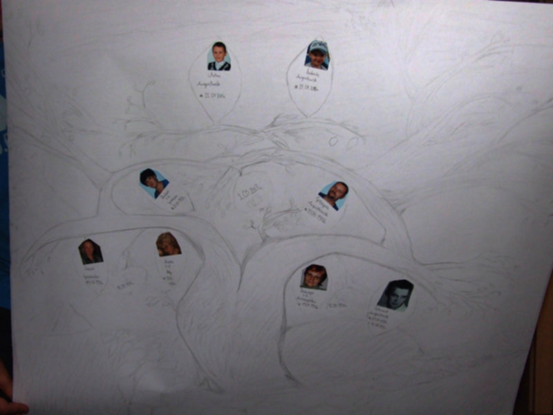 Ja również robiłam z synem w 4 klasie drzewo genealogiczne. Zrobiliśmy w formie drzewka, na górze w dużym jabłku wyciętym z kolorowego papieru był syn, obok strzałka i drugie jabłko, imię brata, a póżniej na dolnych gałązkach rodzice, na następnych w dół dziadkowie, a później pradziadkowie. Imiona i nazwiska oraz daty naklejaliśmy na jabłkach. Później podoklejaliśmy na drzewko liski. Niestety nie mam możliwości zeskanowania, ponieważ drzewko jest duże, ale syn dostał 6, póżniej to samo robili na angielskim tylko po angielsku. Pozdrawiam
