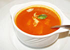 Krem pomidorowy, befsztyk wołowy, frytki, zestaw surówek.