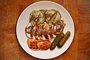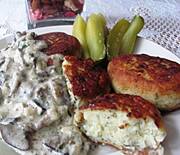 Kotlety ziemniaczane, sos z grzybów leśnych i ogórek kiszony