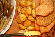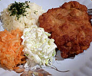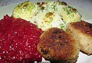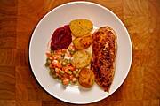Smażona pierś z kurczaka, pieczone ziemniaki, marchewka z groszkiem, ćwikła z chrzanem.