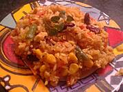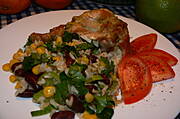 Wczorajszy kurczak pieczony z jabłkiem i majerankiem,ryż z porem,kukurydzą i fasolą z odrobiną czosnku i imbiru ...
