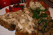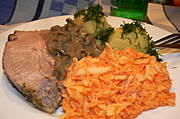 Pieczeń rzymska w sosie pomidorowo-pieczarkowym z przepisu MR, ziemniaczki i koperkiem i surówka z marchewki.