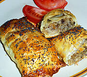 To są paszteciki z gotowego ciasta francuskiego, kroję ciasto na dowolne prostokąty, na jednej stronie ciasta, układam farsz. Przykrywam drugą połową ciasta, sklejam i dociskam widelcem.