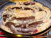 Kaszanka zapiekana z cebulą, ziemniaki, surówka z kiszonej kapusty.