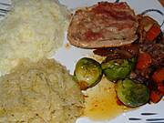 Kurczak pieczony z warzywami według Glumandy, brukselka i mix sałat z sosem balsamicznym.