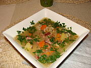 Wczorajszy krupnik z pęczakiem. Na drugie gulasz wieprzowo-warzywny (z cukinią, papryką, marchewką), do niego albo ziemniaczki, albo kasza.