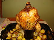Dzisiaj dwie zupki, rekompensata za knajpkowe jedzonko w piątek i sobotę: barszczo-żurek z bekonem i białą kiełbasą i krupnik na żeberku i wędzonce. Drugie danie "bezrobotne", kurczak na butelce, ziemniaki z rozmarynem, jabłko i czosnek.