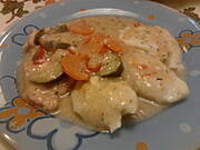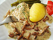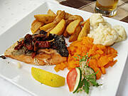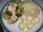 Okoń w sosie śmietanowo-cytrynowym, zielony kalafior, ziemniaki.