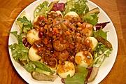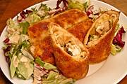 Krokiety z kurczakiem, pieczarkami, żółtym serem, cebulką i natką pietruszki z mieszanką sałat z czosnkowym winegretem.