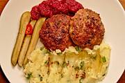 Kotlety mielone, tłuczone ziemniaki ze szczypiorkiem, ćwikła z chrzanem, ogórki z zalewy octowej z musztardą Dijon i chili.