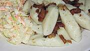 Kopytka okraszone boczkiem i cebulką, surówka z kapusty