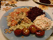 Sos warzywno-mięsny z czubrycą, makaron, buraczki zasmażane (pierwsze w życiu), surówka z pekinki i do wyboru: papryczki faszerowane oliwkami, ogórki w syropie albo winogron marynowany.