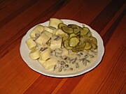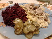 U mnie jak przedwczoraj: łopatka w sosie pieczarkowym, tym razem z makaronem, buraczkami zasmażanymi i ogórkami piekielnymi.