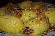 Kopytka z duszoną cebulką i boczkiem.