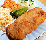 Panierowana pierś z kurczaka, tłuczone ziemniaki z przesmażoną bułką tartą, surówka porowa.