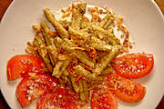 Makaron Casarecce z bazyliowo - pietruszkowym pesto, tartym serem typu Parmezan i pomidorami.