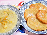 Zupa ogórkowa i placki ziemniaczane, dzieci z cukrem , my ze śmietaną.